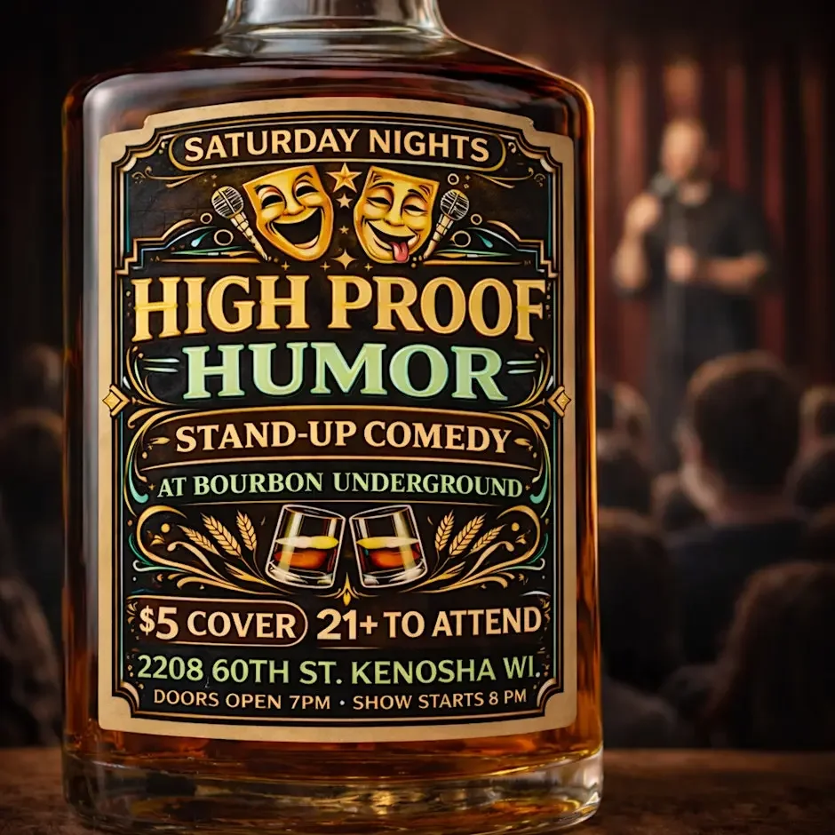 Join us every Saturday for High Proof Humor, a stand-up comedy showcase featuring multiple Midwest comedians performing unfiltered, no-holds-barred comedy. Expect sharp punchlines, bold perspectives, and nonstop laughs in an intimate underground setting.